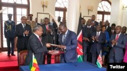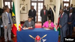 ኬንያ ከኢትዮጵያ ጋር የተፈራረመቻቸዉን ስምምነቶች ኢትዮጵያን በመወከል የዉጪ ጉዳይ ሚኒስትሩ ዶ/ር ቴዎድሮስ አድሃኖም፣ የትራንፖርት ሚኒስትሩ አቶ ገበየሁ ወርቅነህ፣ የማዕድንና ኢኔርጂ ሚኒስትሩ አቶ ቶሎሳ ሻጌና የእርሻና የተፈጥሮ ሃብት ሚኒስትሩ አቶ ስለሺህ ጌታሁን ስምምነቶቹን ተፈራርመዋል።